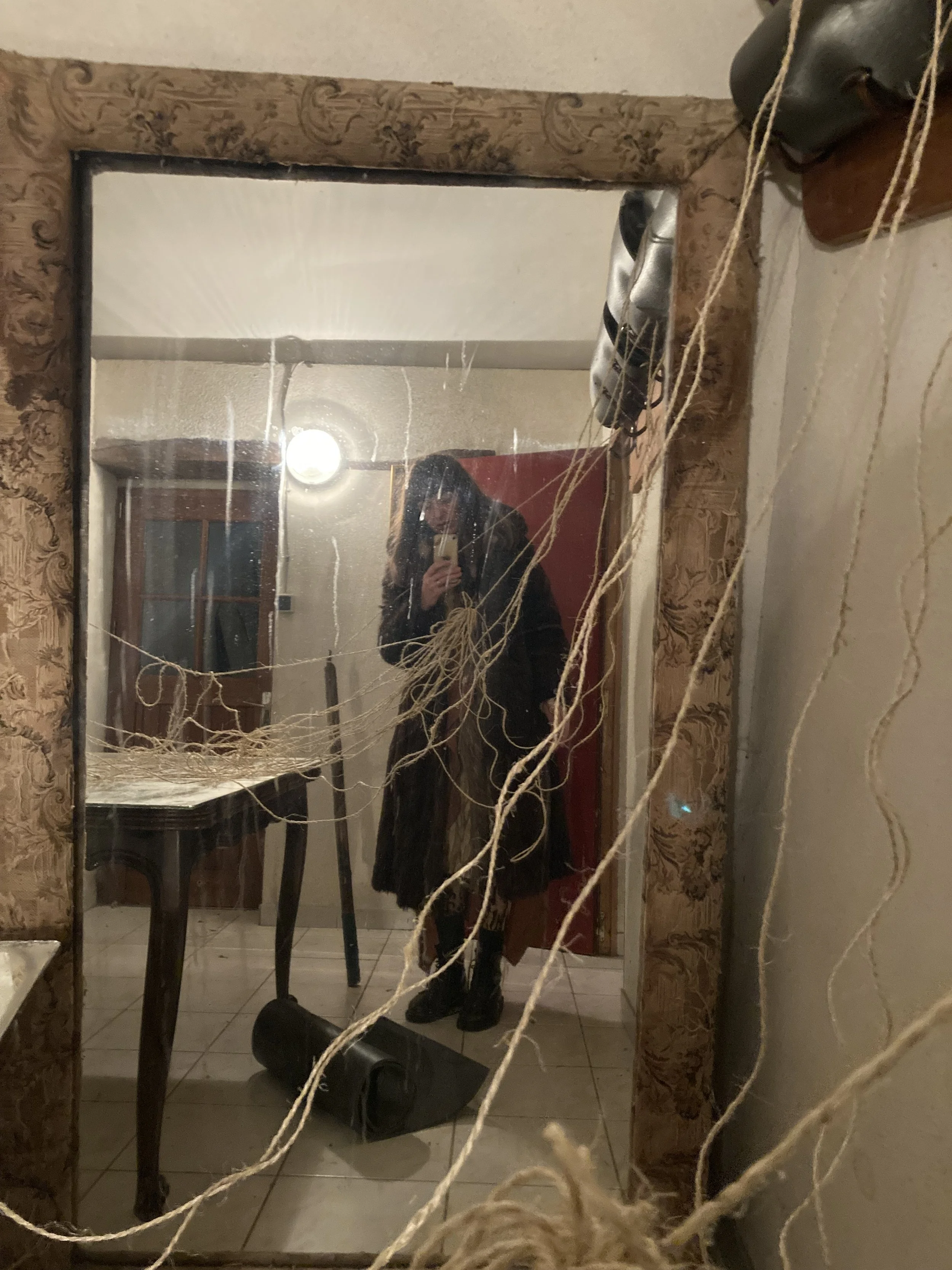 Behind was a door to a small room that I created a House of Mirrors inside with tangled twine rope around the broken , old , and imperfect mirrors …