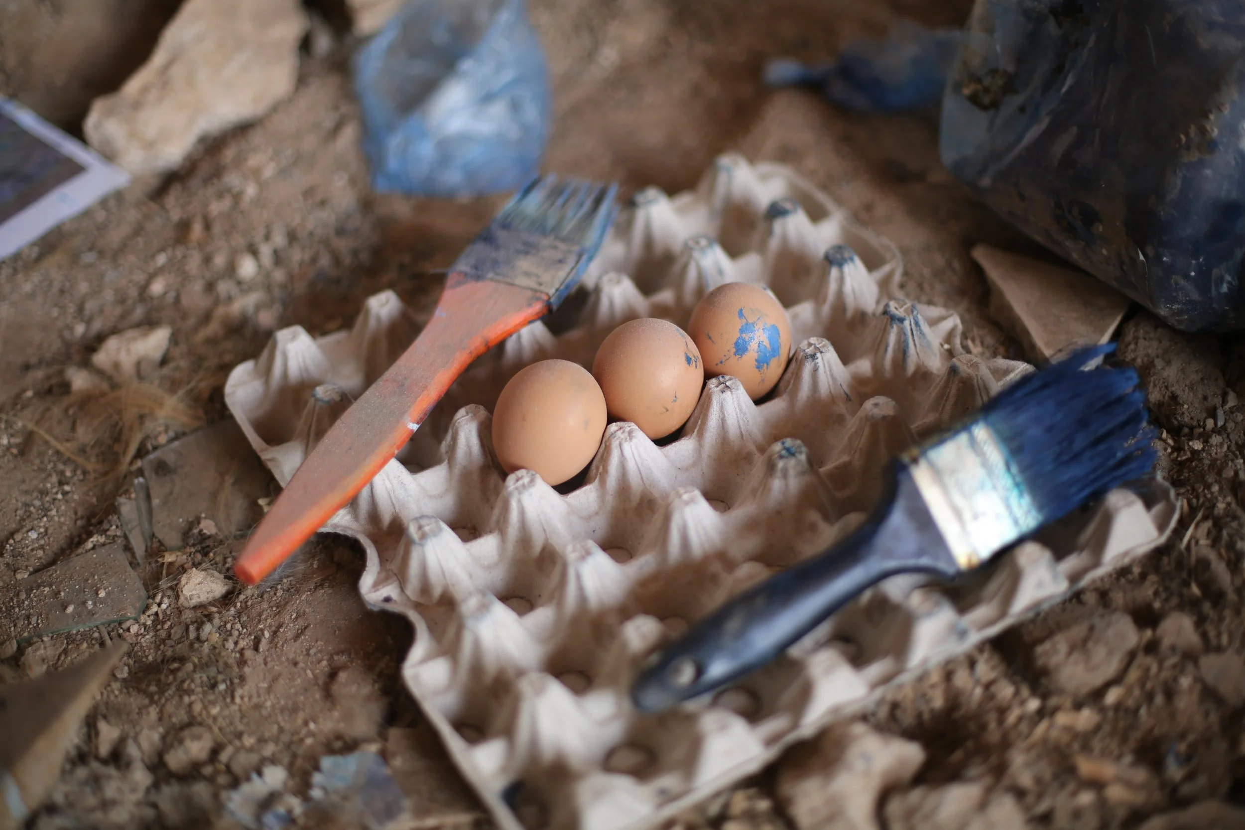Once I have found the pigments I want to use, I transform their raw form into tempera. I use linseed oil to create an oil-based paint and then add the yellow of an egg yolk. It was really on the recommendation of an Italian friend I met in Nice who advised me to look into tempera, an old renaissance technique that uses the yolk of an egg to basically act as a binder so it will last longer. After that, I found this wonderful old classic book explaining how to create it. It’s wonderful, almost like a meditation. Something I really love about it is the process – how you take the egg yolk and you dry it, and then you puncture a very small hole in it and you add it. Everything is measured out – a bit like cooking. And it really works. I use it for most of my work at this point in the hope that the pieces that I create will last a bit longer.