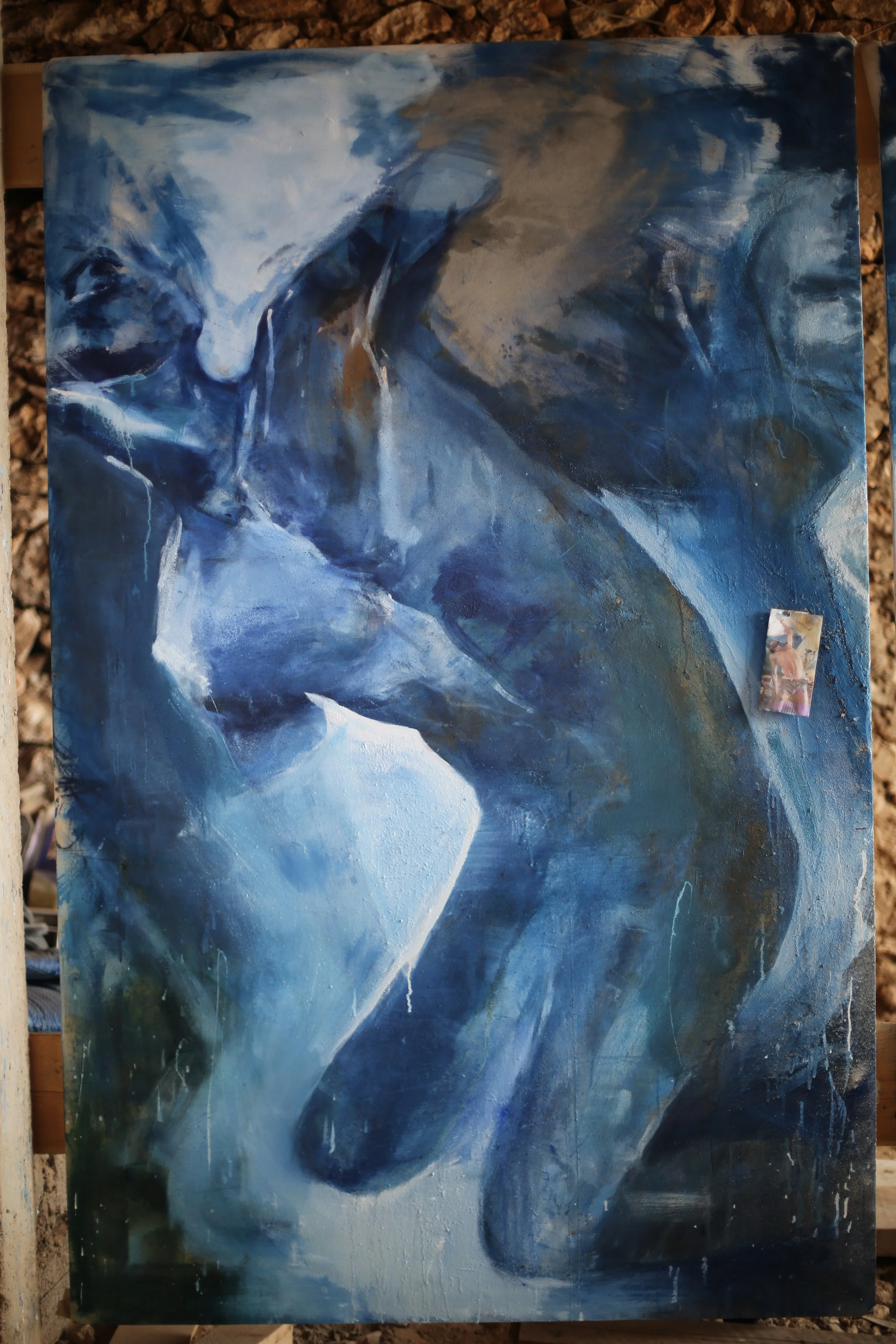 As you can see, the whole painting is created by a variety of different blues, the unique colour for this particular scroll within the scroll series as a whole. I’m fascinated with the colour blue. It’s one of the most illusive colours, one of the hardest to find in nature. Naively for a while I thought you might not even be able to find it in nature, so I was obsessed with this idea of how did the Moroccans create it, how did the Chinese create it, how did the Egyptians create it – and what was particular about these specific cultures that inspired them to create this colour. So this is actually another side project, my sort of search for blue, and I plan on going to these other countries and learning the origins and the technique of creating this blue. As a painter, I think it’s incredibly important to learn how to actually create the pigments. I got the blue pigment itself at a small little spice shop in Essaouira. These blues come from shells, or the rocks of the Atlas mountains, or the flowers you find up north near Chefchaouen. And so it’s all a variety.
