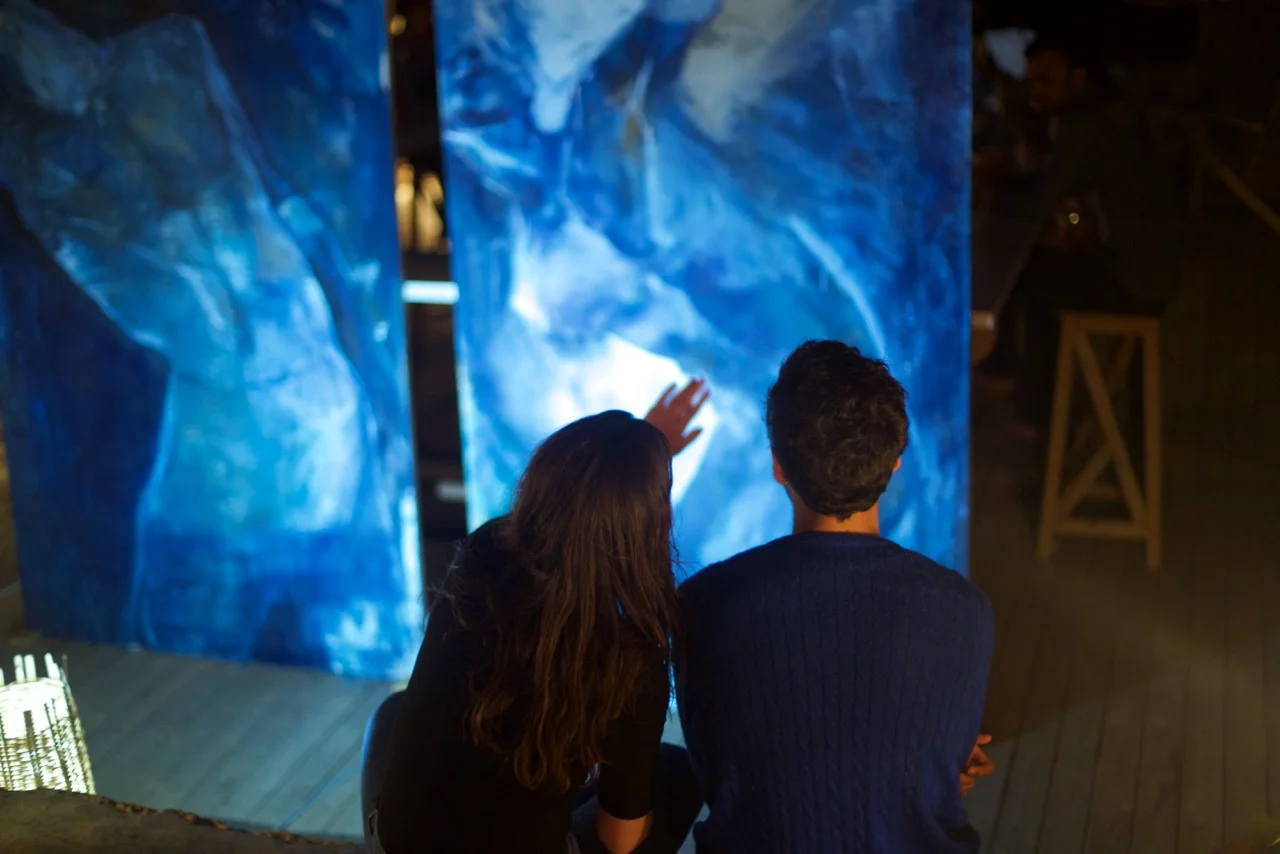 MATERIAL : Blues of Maroc from market turned to tempera , Sahara desert sand , varnish , white house paint