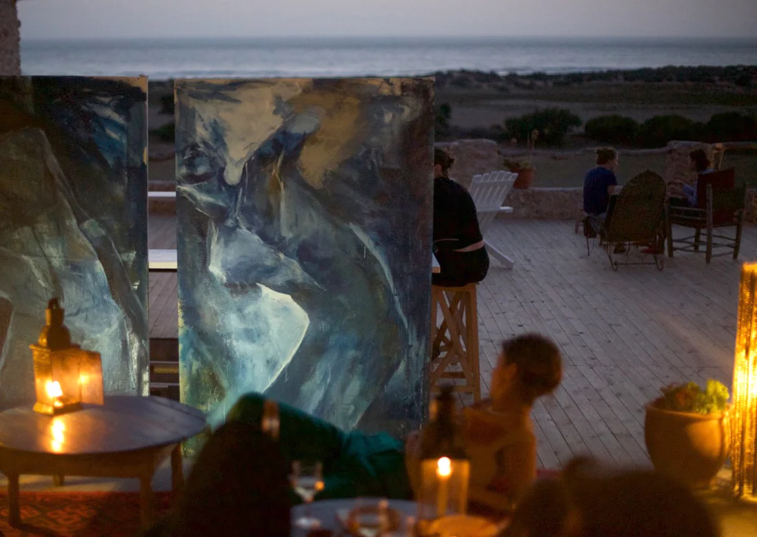 RODS : No rods – this one hangs in space as two separate entities , as the market did not carry the proper size canvas – it had to be cut in half and thus two frames – built by the incredible Renaissance English man out of scrap discarded wood from the Hammam that also acted as a construction site at L’âne Vert .